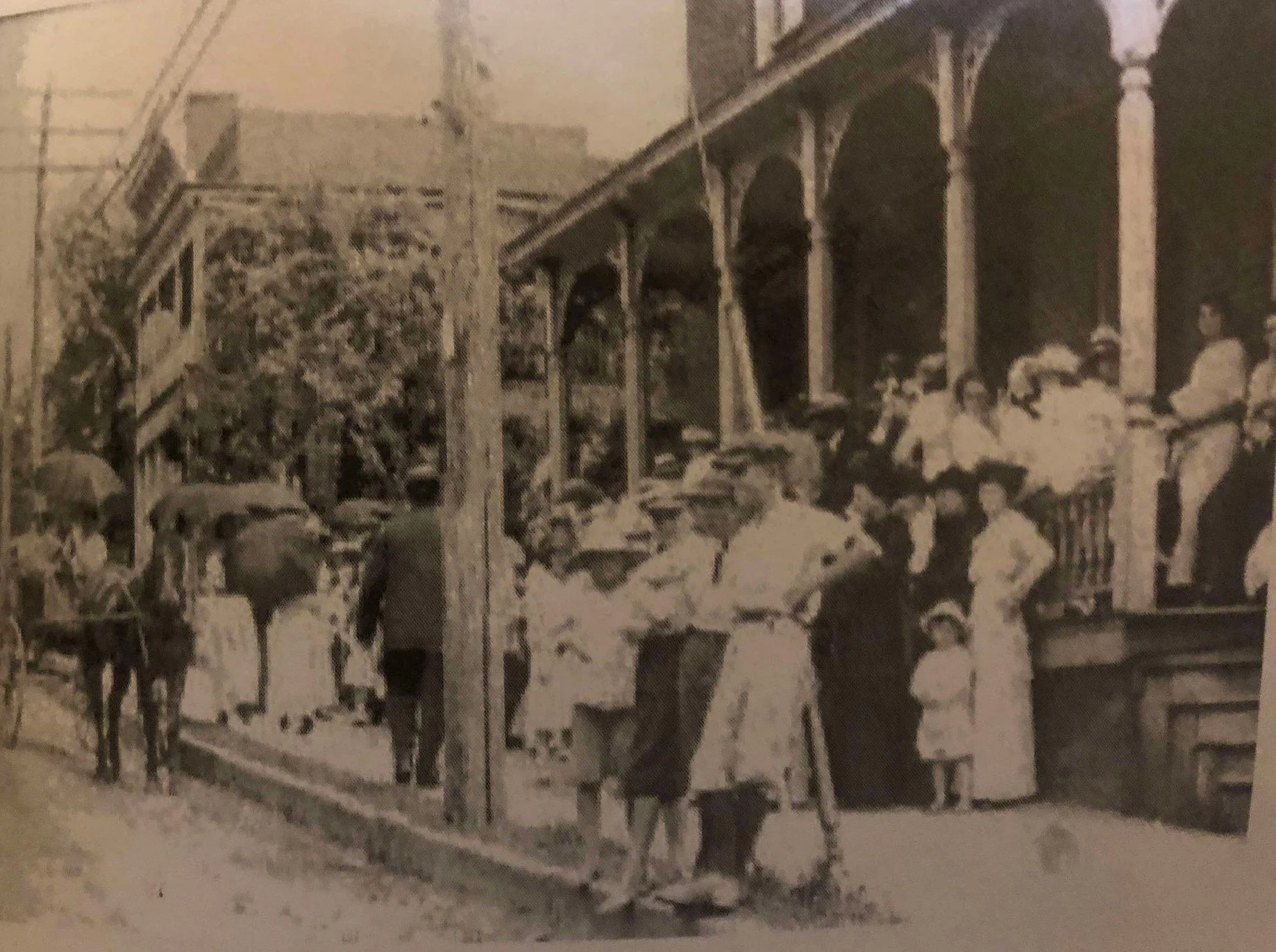 1925, community meetings; 1950, fishing trip; 1975, rescue squad cleared of allegations; 2000, population decline. PHOTO: Crowd in front of the Setback Building; Hotel Hamilton is at left.