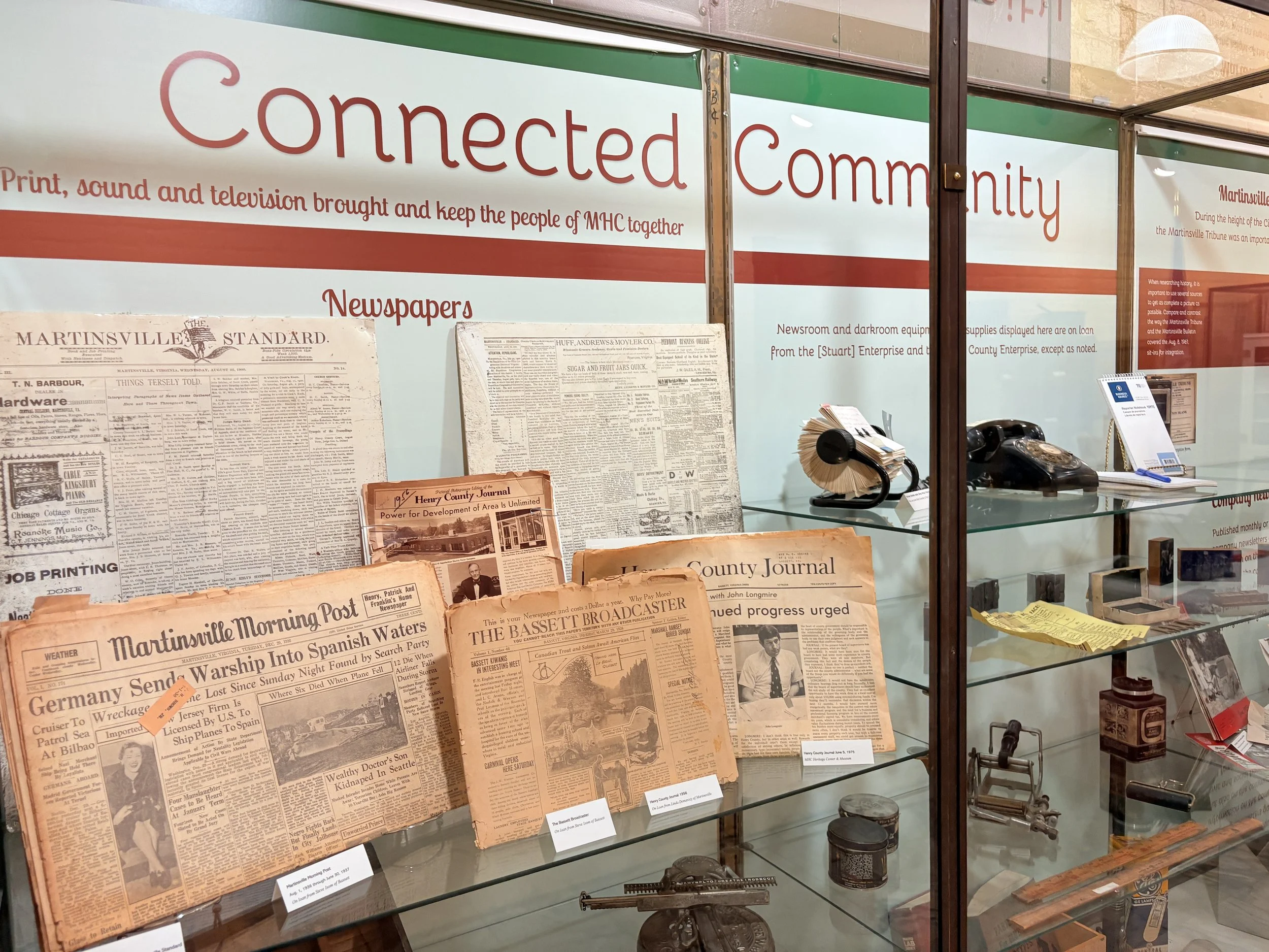 Opened in Fall 2024, “Community Connections” shows how people kept in touch through early newspapers, the beginnings of radio, and then television; plus the wealth of information shared in company newsletters. See an edition of the 1960s black newspaper “Martinsville Tribune,” which has a front-page story on the sit-ins which integrated Martinsville’s lunch counters; read front-page 1921 Henry Bulletin articles that described the first local people listening to the first radio broadcasts; and type on an old typewriter.