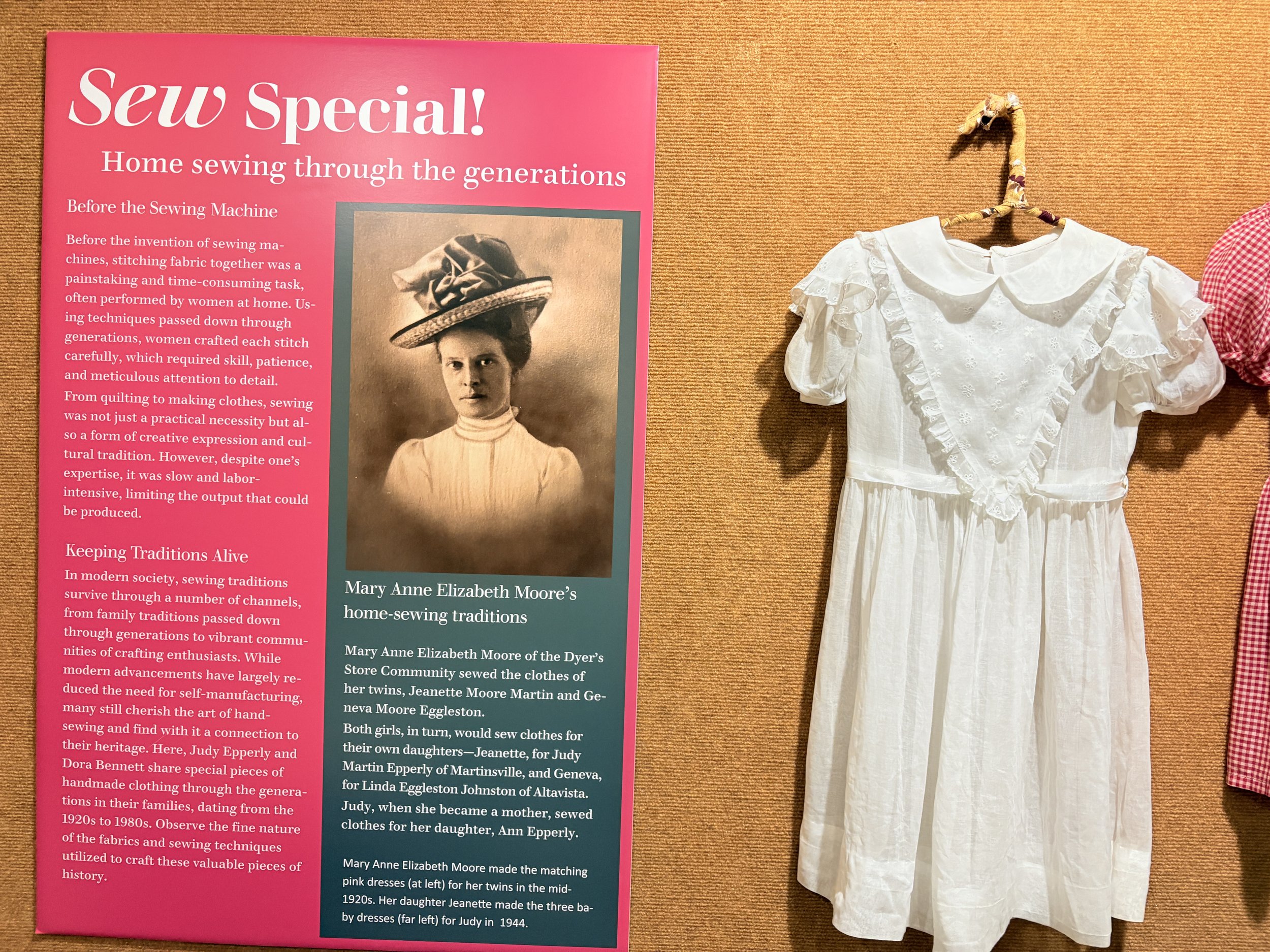 With “Sew Special,” see how women of the past combined utility with beauty in the garments they made for their families. Note the fine craftsmanship of the dresses sewn by Mary Anne Elizabeth Moore, then her twin daughters, who carried on their mother’s skills for their own daughters. Learn the fascinating history of clothes made from feedsacks. Check out the styles of sewing machines and notions through the years.